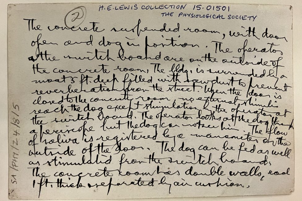 The concrete suspended room, with door open and dog in position. The operator and the switchboard are on the outside of the concrete room. The building is surrounded by a moat 5ft deep filled with sawdust to prevent reverberation from the street. When the door is closed to the concrete room no external stimuli reach the dog except stimulation by the operator at the switchboard. The operator looks at the dog through a periscope but the dog can not see him. The flow of saliva is registered by a manometer (?) on the outside of the door. The dog can be fed as well as stimulated from the switchboards. The concrete room has double walls, and 1ft thick and separated by air cushion.
